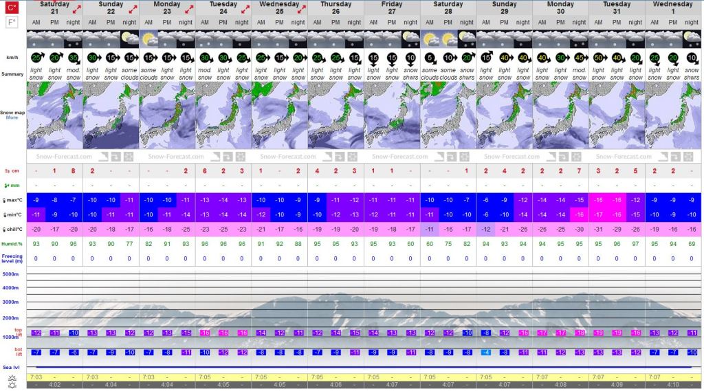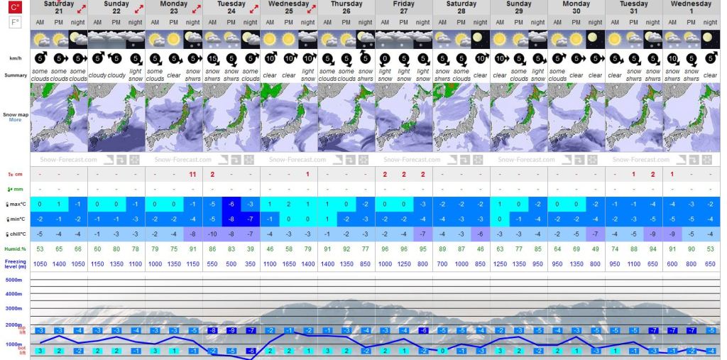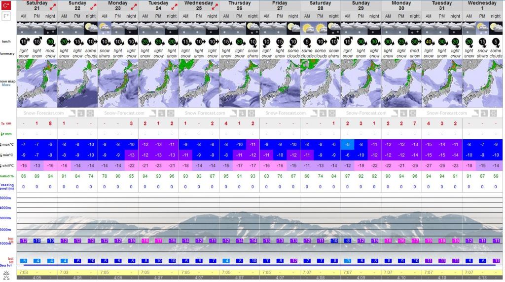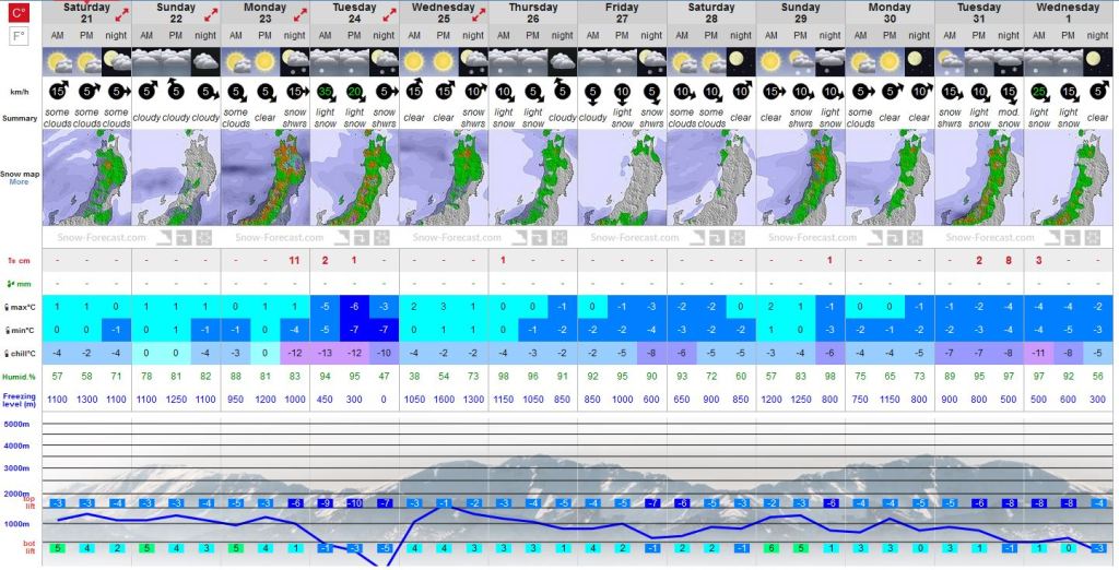 The good news is that things are starting to improve. Check out these 12 day forecasts from our friends at Snowforecast.com. Presently it looks like the mountains of Nagano can expect decent snow on the 23, 27 and 31 Dec, while the resorts of Hokkaido can expect very good snowfalls from now on.